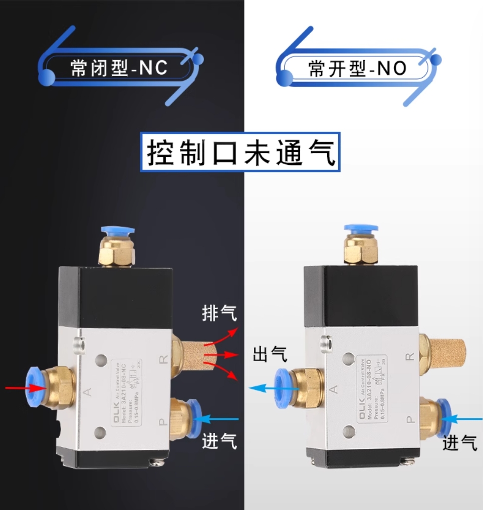 NC (normalement fermé) : la vanne est fermée lorsqu'il n'y a pas d'air, et elle ne peut être ouverte qu'après avoir été entraînée par un signal/pression d'air.