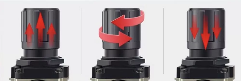 Il y a une échelle de pression sur le capuchon de réglage. Lorsque l'air est fourni, tirez le bouton vers le haut et tournez-le dans le sens des aiguilles d'une montre vers le signe « + » pour augmenter la pression. Après le réglage, appuyez sur le bouton pour le verrouiller.