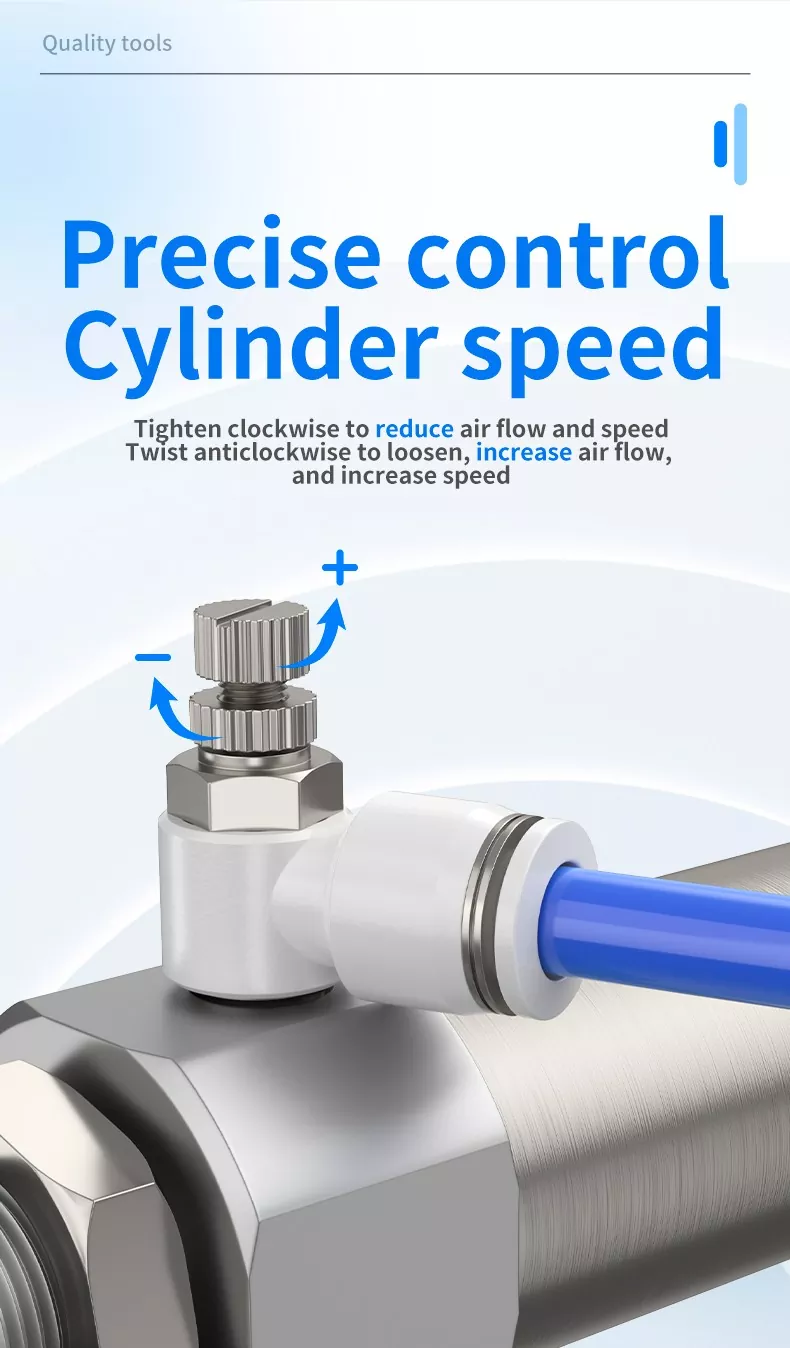 Les régulateurs de vitesse sont des composants pneumatiques courants utilisés pour régler la vitesse d'extension et de rétraction des actionneurs. Les papillons des gaz sont essentiellement des composants de réglage du débit qui contrôlent la vitesse du cylindre, mais leurs positions d'installation, les directions d'étranglement et la conception du corps diffèrent. Selon la méthode de contrôle, ils peuvent être divisés en type d’étranglement d’échappement et type d’étranglement d’entrée.
