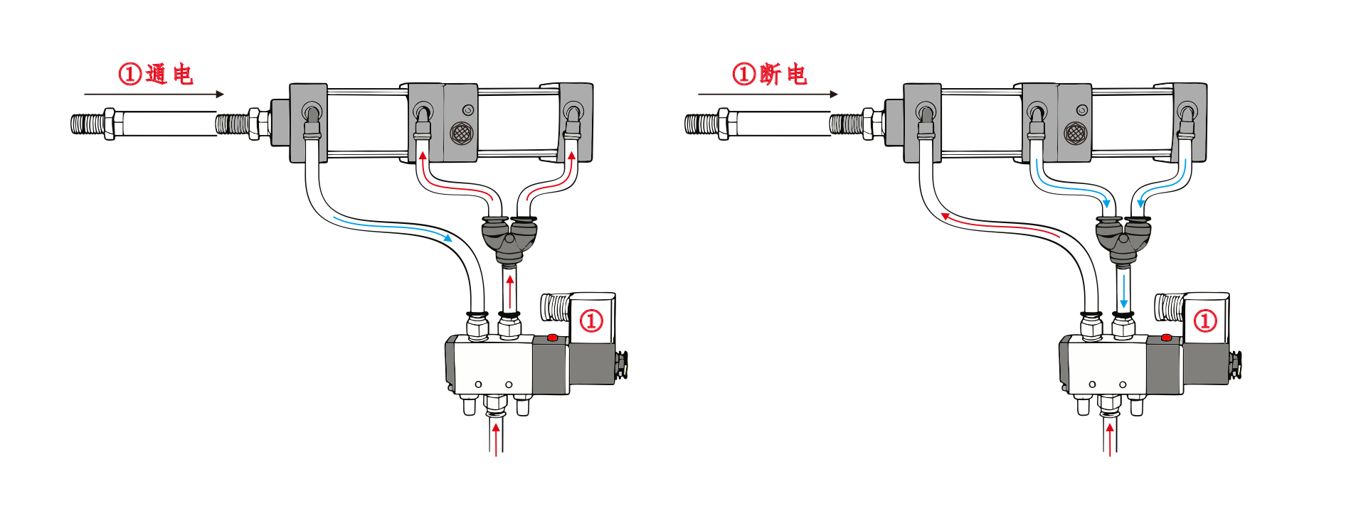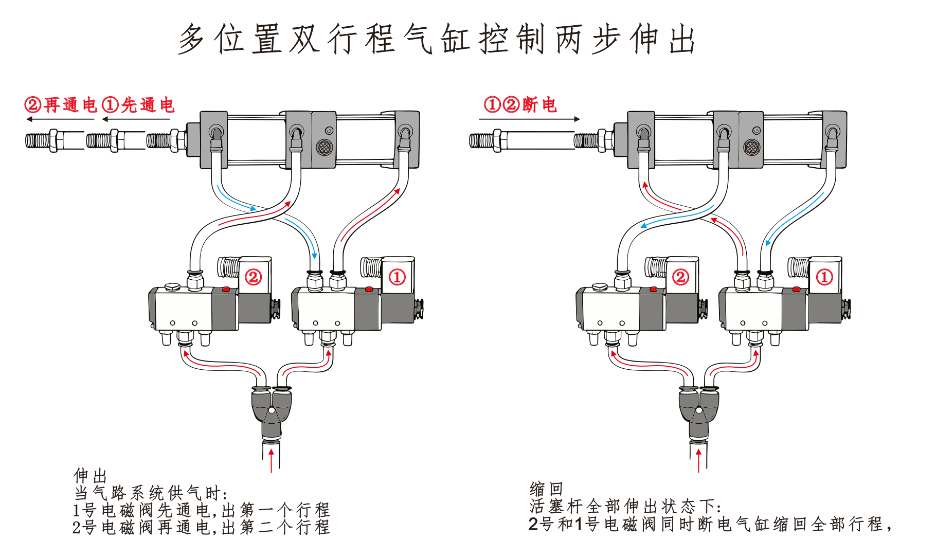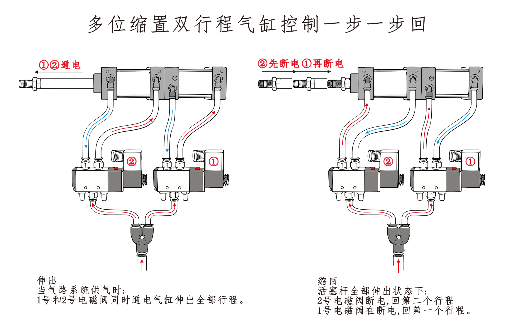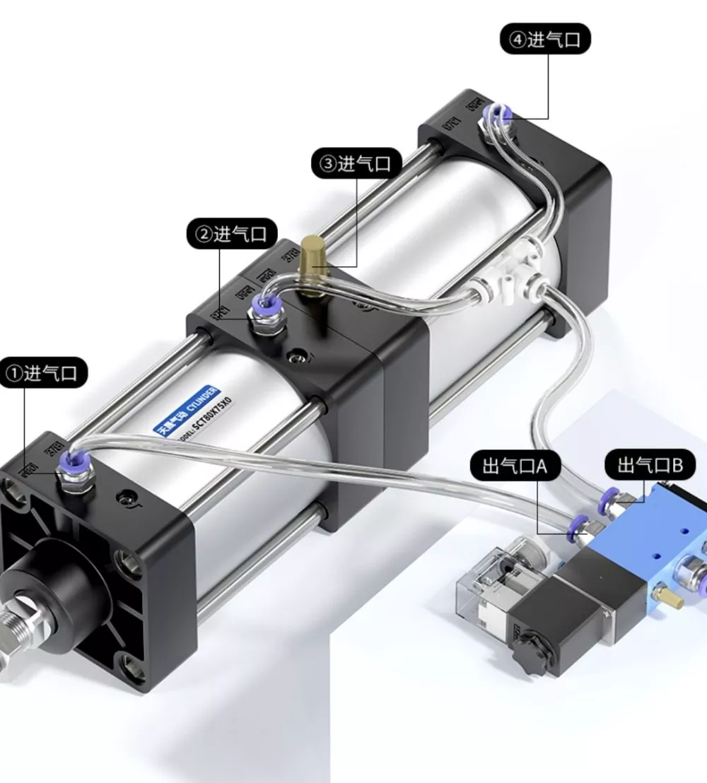 L'entrée d'air du cylindre①est connectée au port A de l'électrovanne, et l'entrée d'air du cylindre④est connectée en série au port B de l'électrovanne. L'entrée d'air du Cylindre③est reliée à un silencieux. Lorsque le port A de l'électrovanne est alimenté, les vérins restent en position rétractée. Lorsque le port B est sous tension, les cylindres commencent à fonctionner.